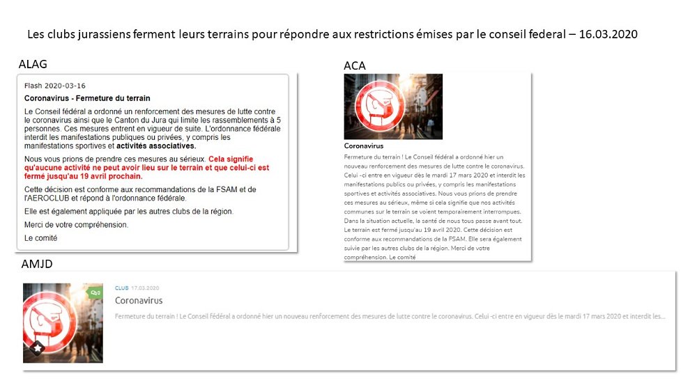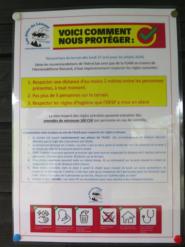 Mais oui. C'est bien Toni qui donne un coup de main pour ranger la salle après le loto de février 2020Fermeture du terrain dès 17.3.2020 selon ordonnance fédérale dans le cadre de la lutte contre le coronavirusles clubs jurassiens suivent les restrictions émises par les autoritésL'organisation mise en place pour la réouverture du terrain sous conditions strictes dès 27 avrilUn dernier coup de pinceau à la table de chargeLes derniers préparatifs pour la réouverture du terrainLundi 27 avril. terrain ouvert avec inscription sur doodle (10 pilotes maximum)Course de tonte entre Cocotte et Philippe SprungerOn bichonne le terraincertain on profité du confinement pour préparer de nouveaux modèles